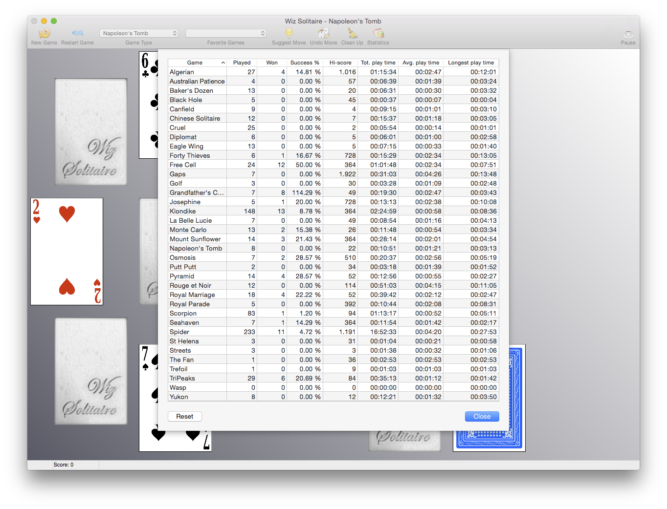 More than 40 types of solitaire are available, including: Agnes Bernauer, Agnes Sorel, Algerian, Australian Patience, Babette, Baker’s Dozen, Black Hole, Canfield, Casket, Chinese Solitaire, Crazy Quilt, Cruel, Diplomat, Eagle Wing, Forty Thieves, Free Cell, Gaps, Golf, Grandfather’s Clock, Josephine, Klondike, Labyrinth, La Belle Lucie, Monte Carlo, Mount Sunflower, Napoleon’s Tomb, Osmosis, Penguin, Putt Putt, Pyramid, Rouge et Noir, Royal Marriage, Royal Parade, Scorpion, Seahaven, Spider, St Helena, Streets, The Clock, The Fan, Trefoil, TriPeaks, Wasp, Windmill, Yukon